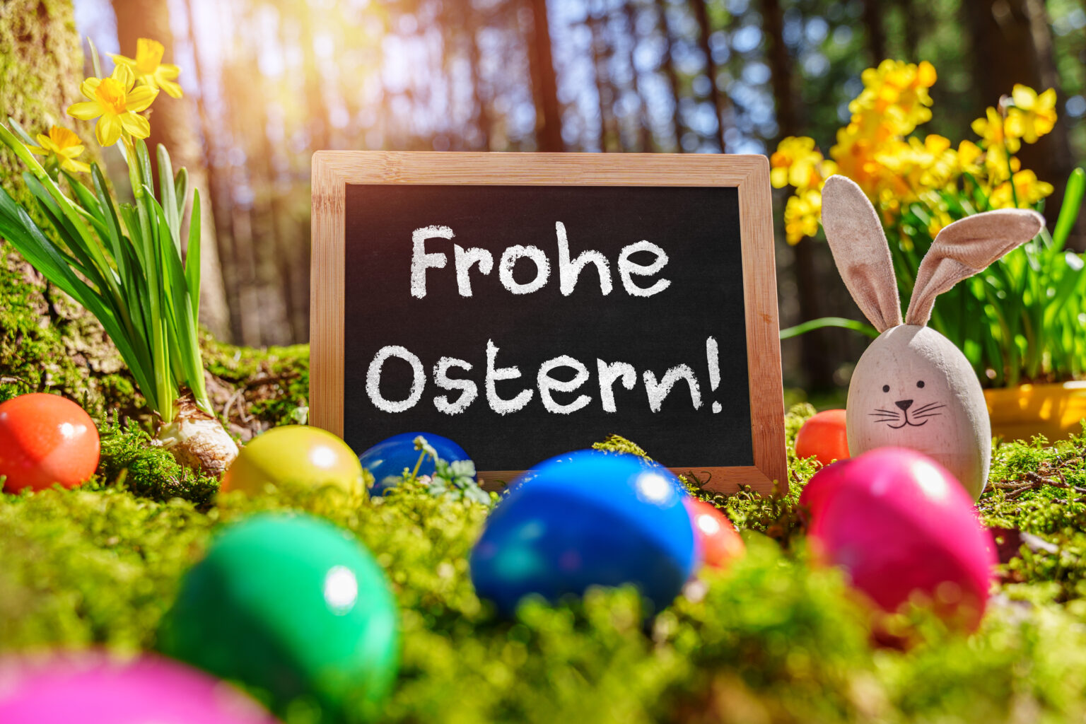 Im Innersten auf dem Bildes befindet sich eine geringe Tafel, die die Botschaft „Frohe Ostern“ zeigt, was zu „Fröhliche Ostern“ übersetzt wird. Dieses leichte und doch charmante Herzstück zieht schnell die das Interesse auf sich und liefert den Feiertags-gruß innerhalb einer herzliche und persönliche Weise. Das handgefertigte Aussehen der Tafel gibt eine rustikale Note, indem die Information sich aufrichtig und zeitlos wirkt, wie sie speziell für den Betrachter erstellt worden wäre Ostern Bilder.